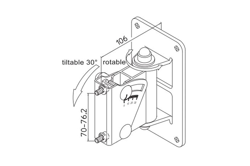 A pan/tilt wall mounting bracket in black or white finish. Tilt is adjustable though 30-degrees, and lockable in position.